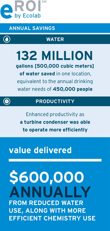 In 2018, Nalco Water identified an opportunity to help the company improve water use efficiency for a turbine condenser at a mill in the United States. This turbine generates nearly all of the plant’s electricity and is a key part of the overall papermaking process. Nalco Water implemented 3D TRASAR™ Water Management Technology to help the turbine condenser operate more efficiently. The impact was two-fold: It optimized production and led to significant water savings. As a result, Nalco Water was able to save the company 132 million gallons of water a year.